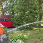 - obsadziliśmy dwoma gatunkami tujek płot wzdłuż linii tramwajowej; p. Andrzej rozplanował miejsca nasadzeń (dzięki!), natomiast my wykopaliśmy dołki, podsypaliśmy je materiałem organicznym z własnych kompostowników, wsadziliśmy i podlaliśmy obficie;