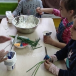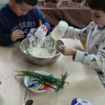 Finał marca to oczywiście Wielkanoc i wizyta Zajączka. Na uroczyste świąteczne śniadanie dzieci same szykowały faszerowane jajka z połączenia żółtek i awokado. Jajeczka, przyozdobione kiełkami i rzeżuchą hodowaną w każdej grupie, wyglądały pięknie, acz smakowały… jednym tak, innym nie 🙂 Zgodnie z oczekiwaniami dzieci Zając przykicał do Przedszkola, a upominki ukrył w ogrodzie. Ich poszukiwanie wymagało trochę gimnastyki fizycznej i mentalnej, zgodnie z instrukcjami zostawionymi na liścikach.