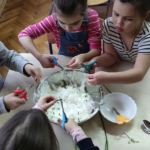Niewątpliwą atrakcją dla starszych dzieci były warsztaty mydlarskie, przeprowadzone przez lokalną Pracownię Edukacyjną Wiatrak (Os. Pod Lipami 8). Przedszkolaki samodzielnie, krok po kroku, wykonywały mydełko glicerynowe w fantazyjnej formie, w wybranym kolorze i o ciekawym zapachu. Każdy mógł wybrać naturalne dodatki (suszone zioła, przyprawy, nasiona), a na koniec zapakować swoje praktyczne, użyteczne i prozdrowotne dziełko, by kogoś obdarować, lub prędko zedrzeć w domu folię i wymydlić całość do zera w niekontrolowany sposób ;-D. Anyway – było fajnie.