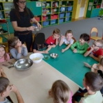Powitaliśmy też „Panią Zimę” Metodą Porannego Kręgu, co zawsze umożliwia dzieciom wielozmysłowe doświadczanie świata. Zaangażowany był wzrok, dzięki przypisanym Zimie kolorom (biały, niebieski), słuch, dzięki dźwiękom dzwonków i trójkątów, węch (świece i kominki zapachowe), smak (miętowa herbatka) oraz obowiązkowo dotyk, w realizowanych eksperymentach – mroźnych, zgodnie z porą roku. Działo się oczywiście dużo więcej, a żeby się dowiedzieć, o czym mowa, zapraszamy do obejrzenia zdjęć.