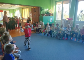 W czerwcu gościliśmy ponownie Zespół KOP, który wystąpił ze swoim najlepszym, niemal musicalowym wydaniu z przedstawieniem: „Idzie lato, co wy na to?”. Ponadto, dzięki uprzejmości i zaangażowaniu rodziców Jasia z grupy IV („Czerwone Kapturki i Wilki”) przedszkolaki spotkały się z maskotką firmy ENEA, Świetlikiem. Świetlik i mama Jasia opowiedzieli dzieciom o tym, jakie są źródła pozyskiwania energii elektrycznej, z uwzględnieniem bezpiecznego korzystania z prądu w domu oraz zachowania podczas wyładowań atmosferycznych. To ważne, szczególnie, że kataklizmy pogodowe nawiedzają nas od czasu do czasu, w szczególności właśnie burze z porywistymi wiatrami.