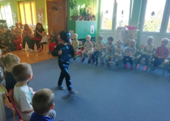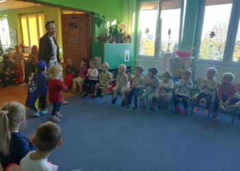 Szóstego października po raz drugi gościliśmy w Przedszkolu charyzmatycznego Pana Szymona ze „Zwjeżaków”, i ze zwierzakami, rzecz jasna :-). Tym razem odwiedził nas Jeż afrykański albinos, który śmiało tuptał w stronę dzieci, węsząc swoim małym noskiem. Wąż Boa okazał się wcale niegroźny i bardzo przywiązany do swojego pana, gdzie czuł się najbezpieczniej. Nie miał nic przeciwko temu, by go pogłaskać, a Pani Dyrektor dobrowolnie poczuła na barkach jego ciężar :-). Ptasznik kędzierzawy był uprzejmy pokazać nam swoją przędzę, która, rzecz jasna i oczywista, produkowana jest i wysnuwana prosto z odwłoka. Sama się nie wysnuła, tutaj zasługa Pana Szymona, który zna się na anatomii zwierząt, jak mało kto! Z kolei Skorpion Heterometrus wyglądał trochę jak wyjęty z wody rak, z tym, że rak jest skorupiakiem, a skorpion pajęczakiem. Strasznie to skomplikowane! Żeby było jeszcze dziwniej, skorpiony świecą na zielono w świetle UV! Przyroda jest niesamowita i nieustannie nas zaskakuje. Jedna z teorii jest taka, że fluorescencja w świecie zwierząt również ma ostrzegać przed zagrożeniem pod postacią jadu. Zauroczyła nas pokaźnych rozmiarów Agama brodata o imieniu Kajtuś 🙂 Kajtas zasuwał po karaczana jak ciągnięty na sznurku, a jego skóra była w dotyku jak stara buła! Na deser pojawił się rozleniwiony Tłustogon afrykański, rozkoszny, wielkooki gryzoń, na którego widok wszyscy robili tylko: „Ooooo!”, a on… nic :-). Jak ktoś tak wygląda, to może tylko leżeć i pachnieć!