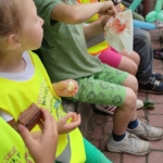 Przyszło lato – czas żniw, i zbiorów! Nasza ciężka praca opłaciła się – w skrzynkach hodowlanych wzorowo wyrosła sałata, szczypior, piękne rzodkiewki (dość ostre), natomiast na marchew i ziemniaki trzeba jeszcze ciut poczekać. W sadzie owocowym zebraliśmy już wszystkie czerwone i białe porzeczki, które trafiły do budyniów naszych przedszkolaków. Jabłuszka rosną powoli, ale i na nie przyjdzie pora. Kwiatki zostawiamy pszczołom :-).
