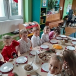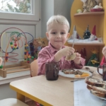 Finał marca to oczywiście Wielkanoc i wizyta Zajączka. Na uroczyste świąteczne śniadanie dzieci same szykowały faszerowane jajka z połączenia żółtek i awokado. Jajeczka, przyozdobione kiełkami i rzeżuchą hodowaną w każdej grupie, wyglądały pięknie, acz smakowały… jednym tak, innym nie 🙂 Zgodnie z oczekiwaniami dzieci Zając przykicał do Przedszkola, a upominki ukrył w ogrodzie. Ich poszukiwanie wymagało trochę gimnastyki fizycznej i mentalnej, zgodnie z instrukcjami zostawionymi na liścikach.