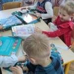 – wyjście Pomarańczowych i Niebieskich Moli Książkowych (gr V i IV) do Biblioteki w Osiedlowym Domu Kultury „Pod Lipami” na lekcję zapoznawczą, dzięki której dzieci poznały budynek, zbiory biblioteczne i pracę bibliotekarki (bibliotekarzy brak na stanie). Zachęcamy do odwiedzania pobliskiej biblioteki – mają świetne książki, które można oglądać i „pochłaniać” na miejscu w przytulnej czytelni :-). W zbiorach znajdują się też komiksy i gry planszowe – dla każdego coś miłego!