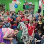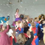 Kolejną atrakcją karnawałową był pokaz iluzjonistyczny Armanda Górnego, który zafundował dzieciom dobrą zabawę ubraną w magiczne sztuczki. Przedszkolaki nie wierzyły własnym oczom, ponieważ artysta sprawiał, że przedmioty znikały, pojawiały się znikąd, zmieniały kolory lub wyginały się, choć teoretycznie nie powinny. Nie będziemy zdradzać, co się tam działo – to trzeba po prostu zobaczyć! 🙂
