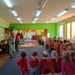 Krótko przed wakacjami, które dotyczą w przedszkolu i lipca, i sierpnia (w lipcu stawiamy na zabawę i relaks w naszych ogrodach, w sierpniu zwijamy interes;-)) mieliśmy jeszcze dwie przemiłe wizyty. Pierwsza z nich to przedstawienie teatralne pt. „Czerwony Kapturek”, które wystawili dla dzieci nasi absolwenci, uczęszczający do pobliskiego ZSzOS. Gratulujemy świetnego występu – gry aktorskiej z zabawnymi motywami i bezbłędnego wykonu piosenek (np. „Kaczka Dziwaczka”). Byliście cudni, brawa dla Pani nauczycielki za przygotowanie Was do występu!