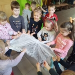 Powitaliśmy też „Panią Zimę” Metodą Porannego Kręgu, co zawsze umożliwia dzieciom wielozmysłowe doświadczanie świata. Zaangażowany był wzrok, dzięki przypisanym Zimie kolorom (biały, niebieski), słuch, dzięki dźwiękom dzwonków i trójkątów, węch (świece i kominki zapachowe), smak (miętowa herbatka) oraz obowiązkowo dotyk, w realizowanych eksperymentach – mroźnych, zgodnie z porą roku. Działo się oczywiście dużo więcej, a żeby się dowiedzieć, o czym mowa, zapraszamy do obejrzenia zdjęć.