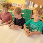 Finał marca to oczywiście Wielkanoc i wizyta Zajączka. Na uroczyste świąteczne śniadanie dzieci same szykowały faszerowane jajka z połączenia żółtek i awokado. Jajeczka, przyozdobione kiełkami i rzeżuchą hodowaną w każdej grupie, wyglądały pięknie, acz smakowały… jednym tak, innym nie 🙂 Zgodnie z oczekiwaniami dzieci Zając przykicał do Przedszkola, a upominki ukrył w ogrodzie. Ich poszukiwanie wymagało trochę gimnastyki fizycznej i mentalnej, zgodnie z instrukcjami zostawionymi na liścikach.