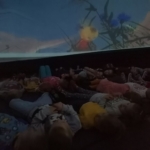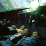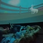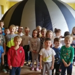 W połowie września chętne dzieci uczestniczyły w seansie filmu animowanego w Kinie Sferycznym. Na zdjęciach widać, że pozycja horyzontalna sprzyjała relaksacji, aczkolwiek wymagana była też szczypta dzielności – w końcu była to zamknięta, mroczna przestrzeń! Nikogo to nie pokonało 🙂