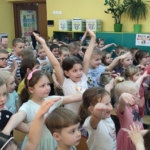 W czerwcu gościliśmy ponownie Zespół KOP, który wystąpił ze swoim najlepszym, niemal musicalowym wydaniu z przedstawieniem: „Idzie lato, co wy na to?”. Ponadto, dzięki uprzejmości i zaangażowaniu rodziców Jasia z grupy IV („Czerwone Kapturki i Wilki”) przedszkolaki spotkały się z maskotką firmy ENEA, Świetlikiem. Świetlik i mama Jasia opowiedzieli dzieciom o tym, jakie są źródła pozyskiwania energii elektrycznej, z uwzględnieniem bezpiecznego korzystania z prądu w domu oraz zachowania podczas wyładowań atmosferycznych. To ważne, szczególnie, że kataklizmy pogodowe nawiedzają nas od czasu do czasu, w szczególności właśnie burze z porywistymi wiatrami.