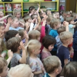 Palmę pierwszeństwa i tak trzeba przyznać żywym zwierzakom. Były to konkretnie „Zwjeżaki” Pana Szymona: wąż boa, wąż zbożowy, agama brodata, kameleon, gekon, ptasznik, jeż afrykański i lotopałanka australijska. Dzieci miały okazję dowiedzieć się więcej o cechach, trybie życia i pochodzeniu tych egzotycznych stworzeń. Pan Szymon pokazał, jak spożywają żywy pokarm, tuptają swoimi małymi łapeczkami, jak skaczą (lotopałanka – HIT), jak zmieniają kolor (kameleon), jak chodzą po ścianach (gekon) jak produkują pajęczynę (to wiadomo:-)). Dzieci dowiedziały się też, że przetrwanie tych gatunków zależy od nas – ludzi – od świadomych wyborów na co dzień (np. unikanie oleju palmowego oraz mądre kupowanie – aby nie marnować żywności i nie gromadzić zbędnych dóbr, które tak naprawdę nie są nam potrzebne). Coś pięknego!